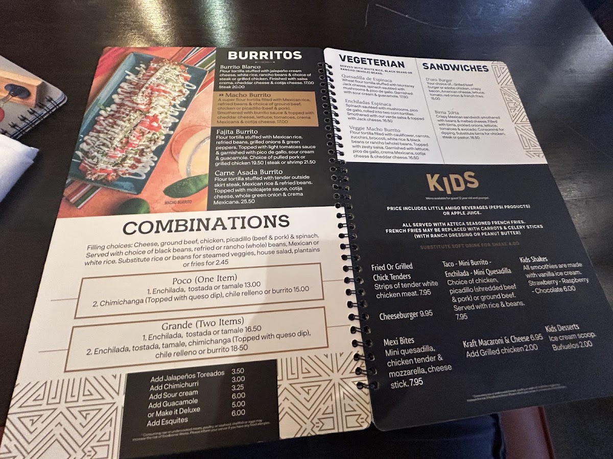 Flour tortilla filled with cauliflower, mushrooms, carrots, zucchini, broccoli, white rice and black beans or Rancho (whole) beans. Topped with verde salsa, Chipotle sauce or Azteca’s special salsa. Garnished with lettuce, pico de gallo, crema Mexicana and Cotija cheese